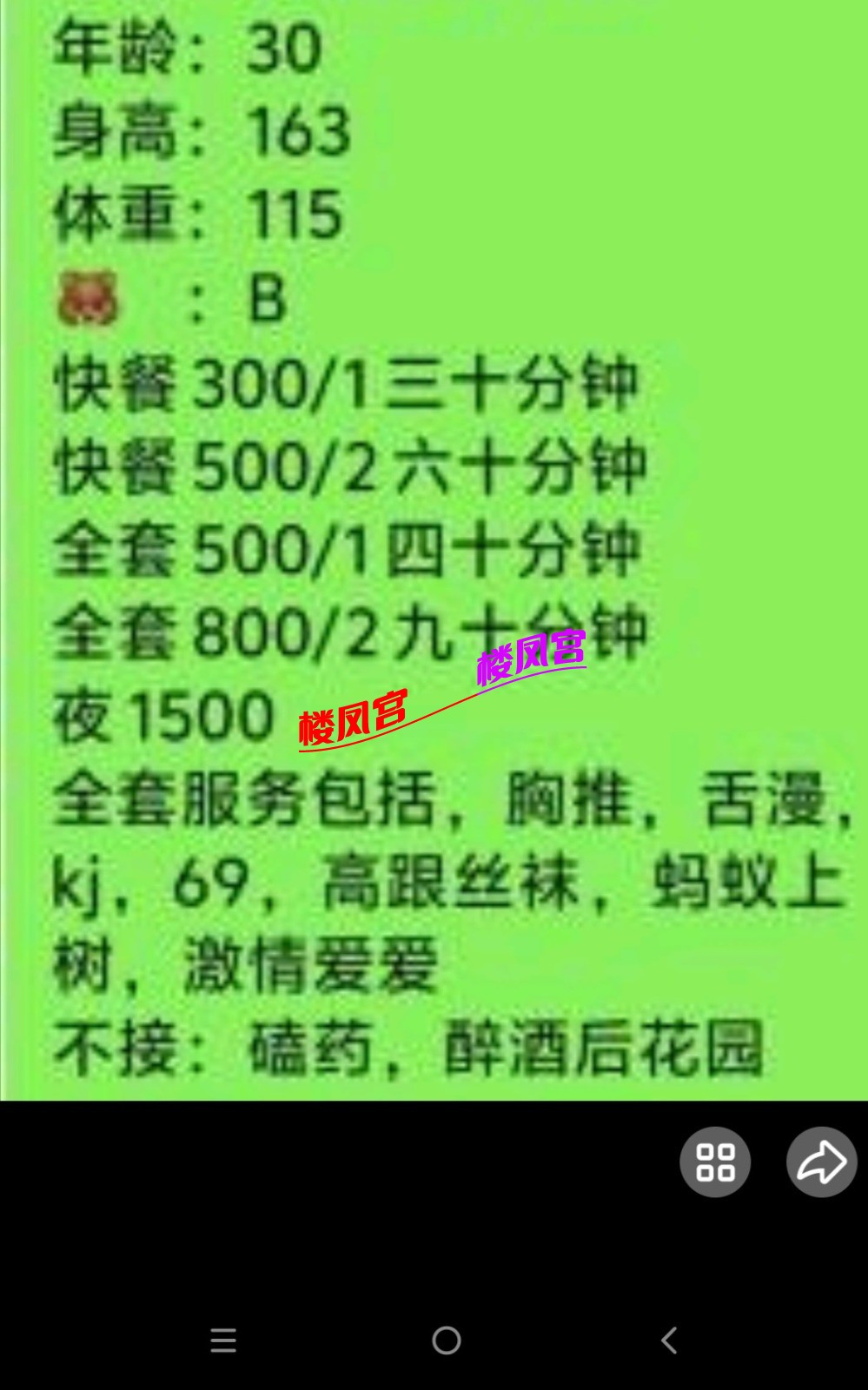 楼凤宫紧急通知:最近冒出许多假APP,宣称美女同城外卖,却是骗充值! 或者以‘QQ聊黄容易封号’为由,要你下载安装安卓APK,却是套你充值! 充值之后血本无归,根本没有妹子! 死骗子们又声称让你再次充值就可以退款前一次的充值,实际上却是骗你充值更多!约妹前必看此联系方式是否名列 本站的“骗子专贴”(全网独一无二!每天更新)!