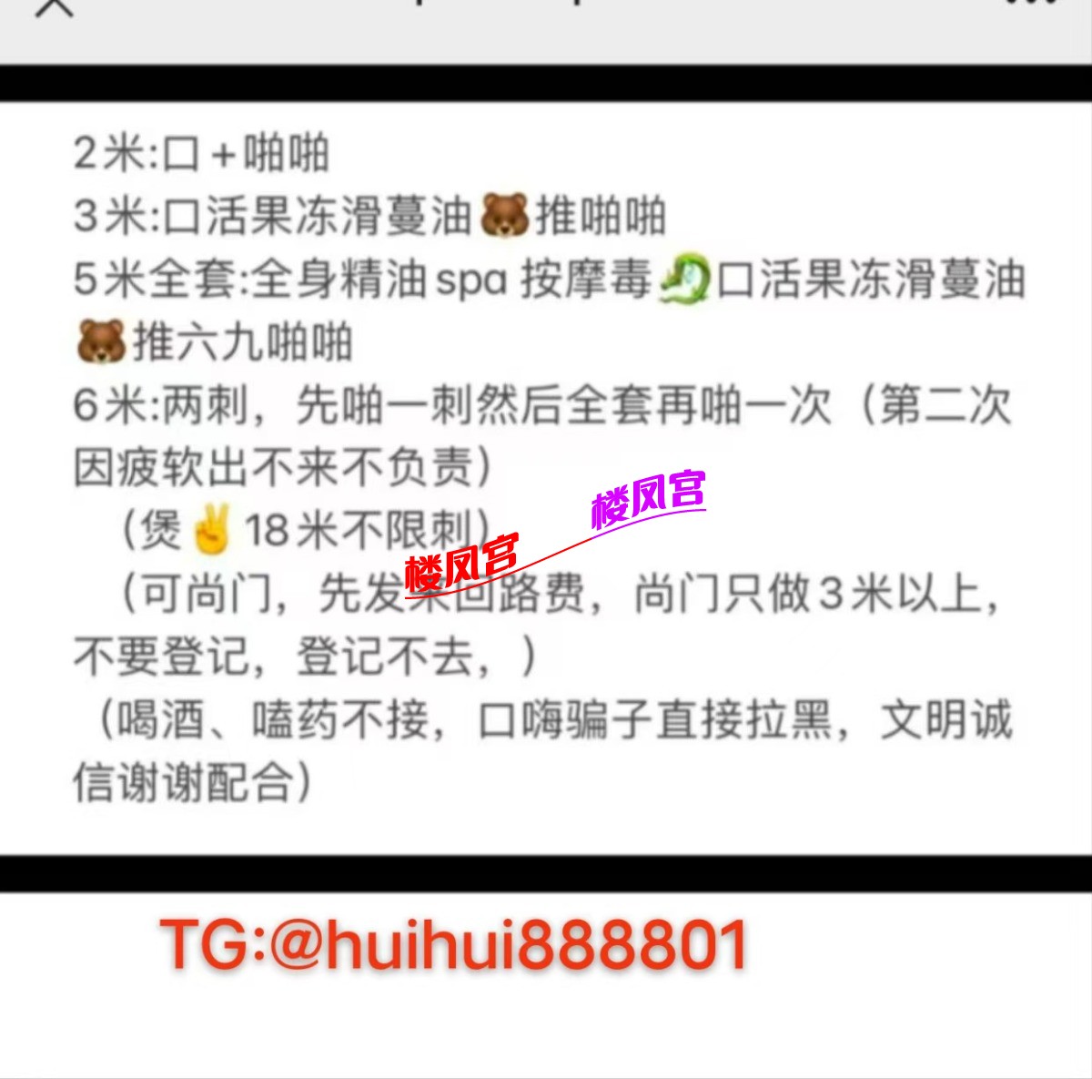 楼凤宫紧急通知:最近冒出许多假APP,宣称美女同城外卖,却是骗充值! 或者以‘QQ聊黄容易封号’为由,要你下载安装安卓APK,却是套你充值! 充值之后血本无归,根本没有妹子! 死骗子们又声称让你再次充值就可以退款前一次的充值,实际上却是骗你充值更多!约妹前必看此联系方式是否名列 本站的“骗子专贴”(全网独一无二!每天更新)!