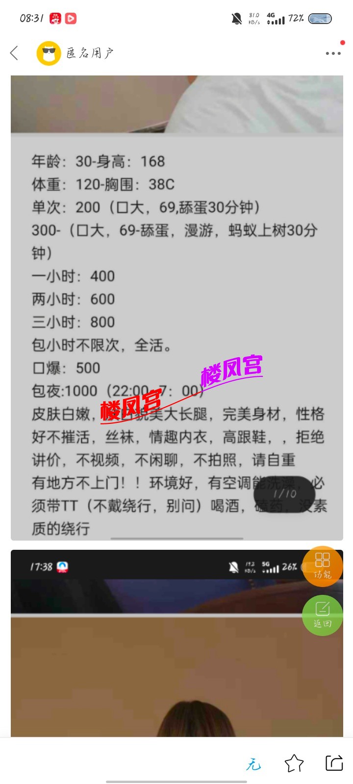 楼凤宫紧急通知:最近冒出许多假APP,宣称美女同城外卖,却是骗充值! 或者以‘QQ聊黄容易封号’为由,要你下载安装安卓APK,却是套你充值! 充值之后血本无归,根本没有妹子! 死骗子们又声称让你再次充值就可以退款前一次的充值,实际上却是骗你充值更多!约妹前必看此联系方式是否名列 本站的“骗子专贴”(全网独一无二!每天更新)!